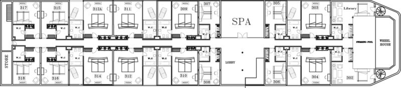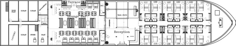 The 8 Upper Deck Terrace Suites also offer an outside terrace with table and chairs. There are 2 Single cabins with standard windows at the front of the Main Deck that can be offered without single supplement.