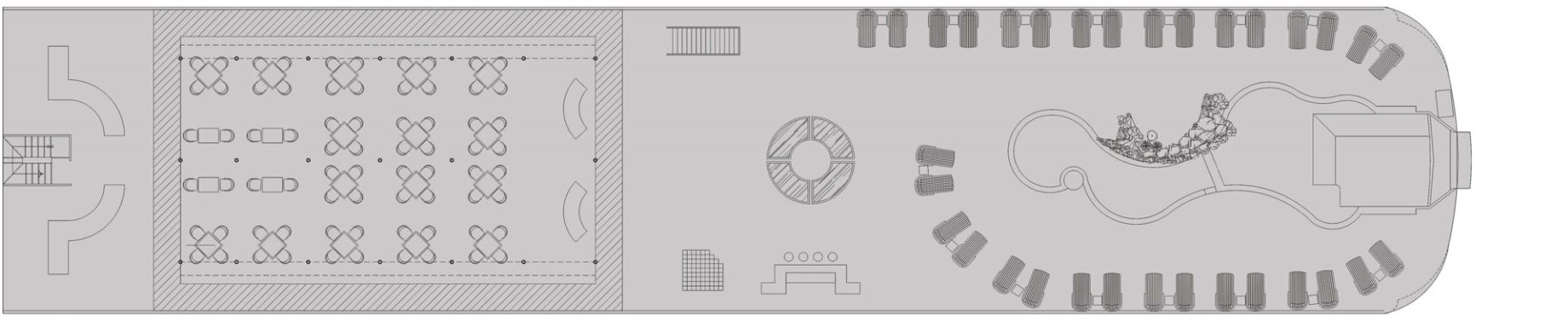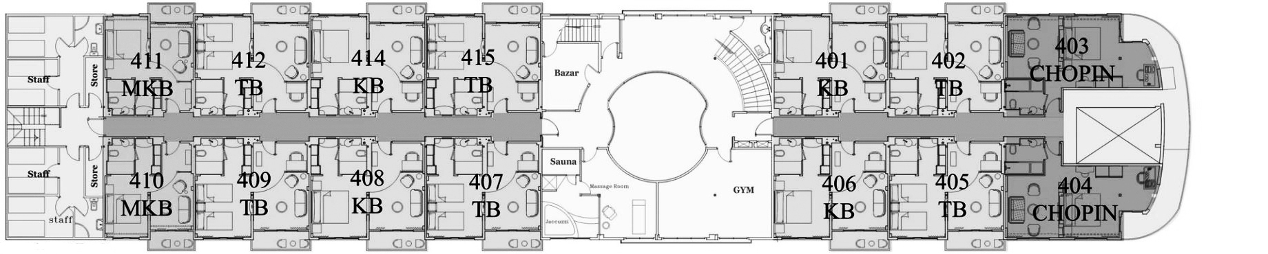 The ship is comprised of 27 deluxe Beethoven Suites, 2 Mozart Suites and 2 superior Chopin Suites. The Beethoven Suites all measure 40m2, each with a private balcony. Each suite has a comfortable sitting area offering maximum comfort and space. All suites offer air- conditioning, satellite TV, mini bar and a safe.