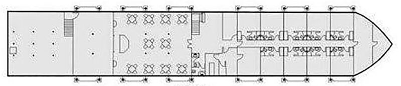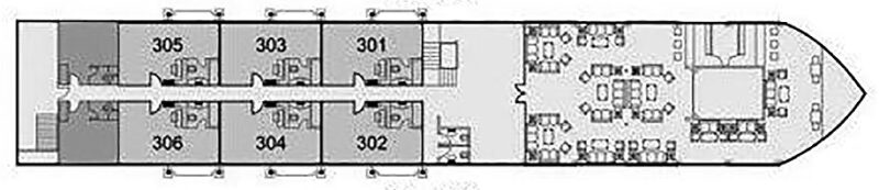 Featuring only 17 suites. All of the suites have large panoramic sliding windows which open onto beautiful private outdoor terrace. All suites feature satellite TV and in-house video channels (only whilst docking), mini bar (stocked once on arrival), music system, safety box and private W/C with shower and hairdryer. Bathrobe & Slippers.
