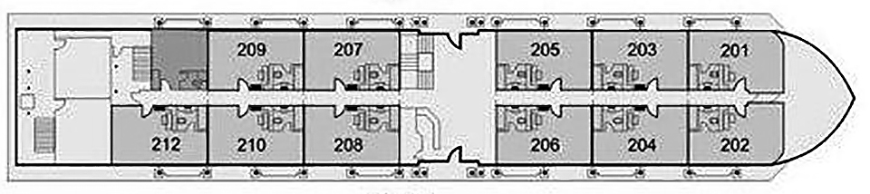 Featuring only 17 suites. All of the suites have large panoramic sliding windows which open onto beautiful private outdoor terrace. All suites feature satellite TV and in-house video channels (only whilst docking), mini bar (stocked once on arrival), music system, safety box and private W/C with shower and hairdryer. Bathrobe & Slippers.